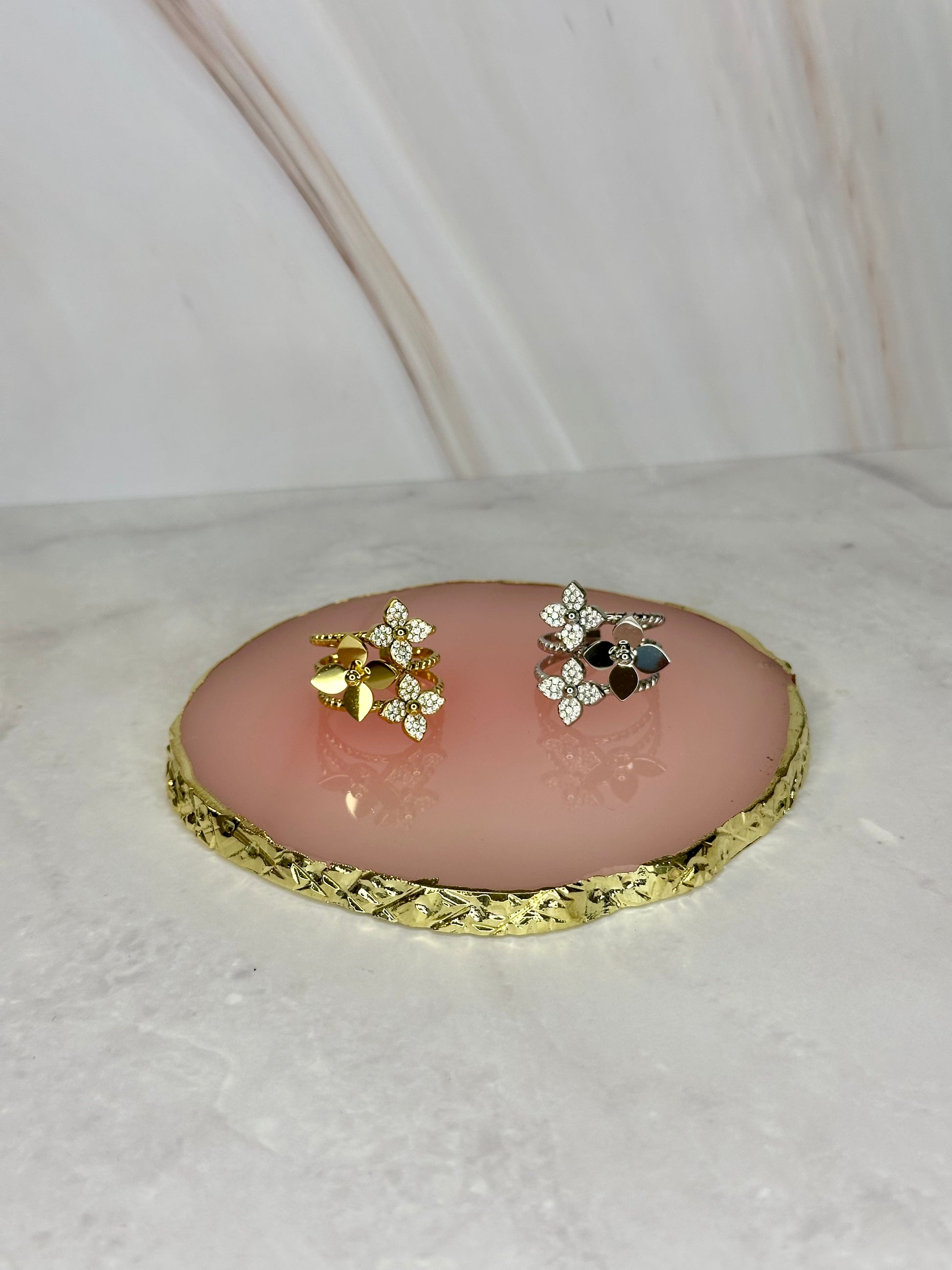 L’anello fiori tris è realizzato in acciaio inossidabile 316L e strass.