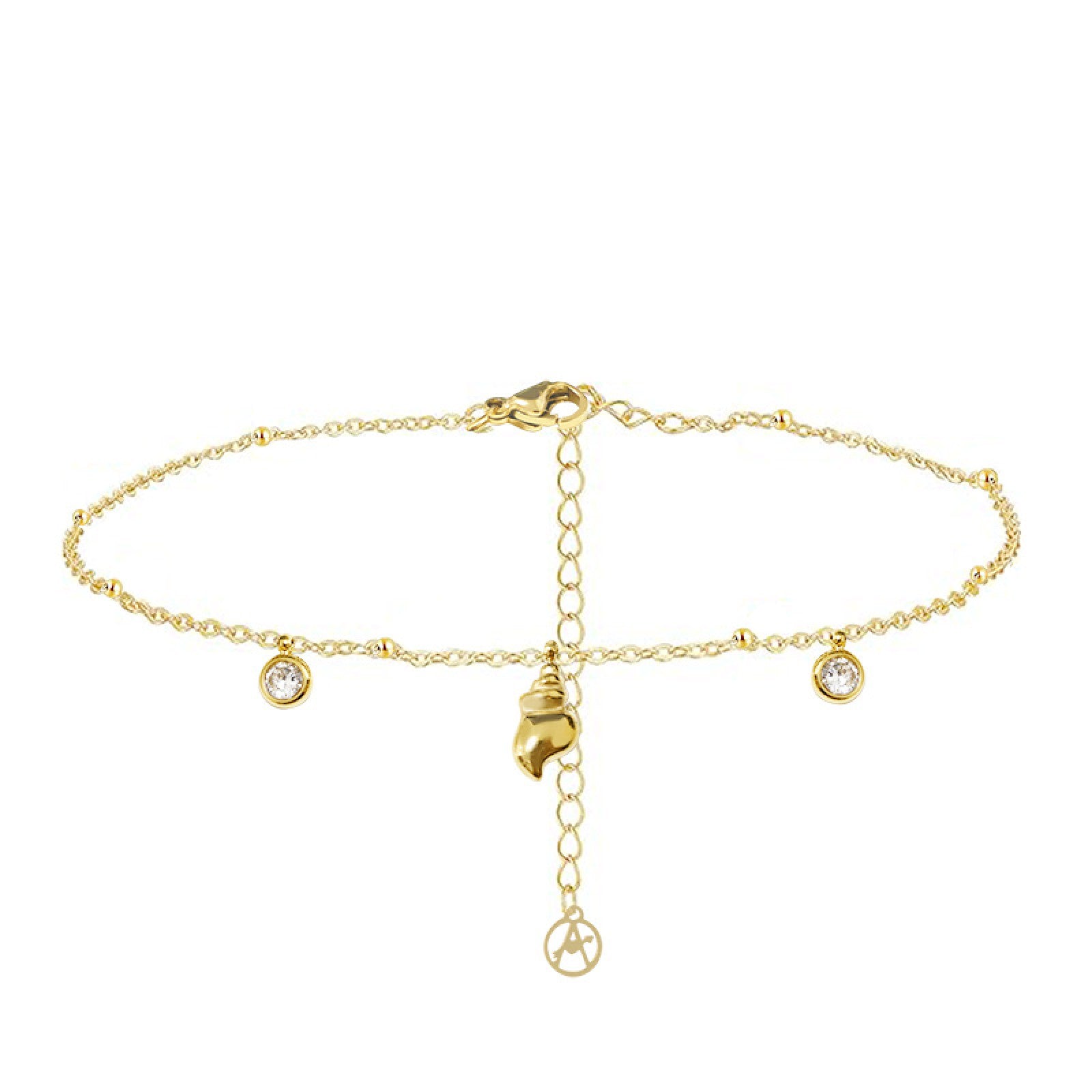 La cavigliera conchiglia è realizzata in acciaio inossidabile 316L e zirconi. Ha una lunghezza di 20cm + 3.5cm di allungamento.