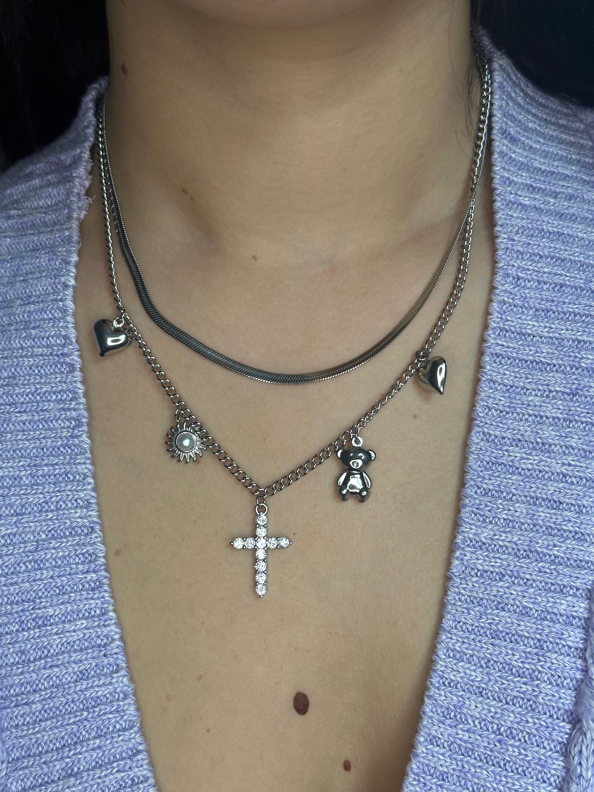 La collana faith è realizzata in acciaio inossidabile 316L e zirconi. È composta da una catena modello snake e una catena classica con 5 ciondoli.