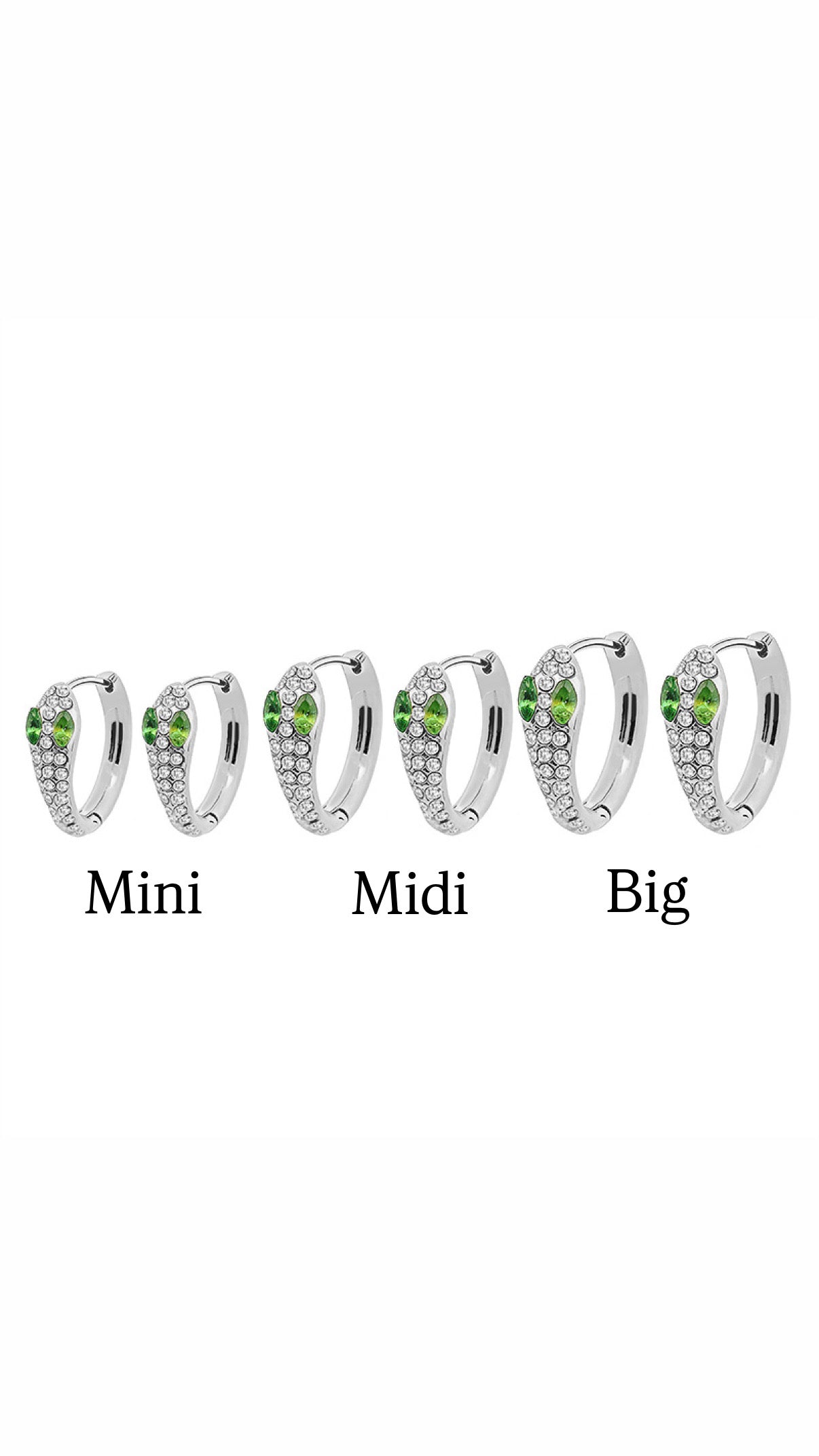 Gli orecchini snake sono realizzati in acciaio inossidabile 316L e zirconi. Hanno un diametro esterno di 12mm (mini) 14mm (midi) 16mm (big).